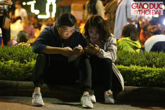 | Nhiều người ngồi nói chuyện, dùng điện thoại để “ giết” thời gian |