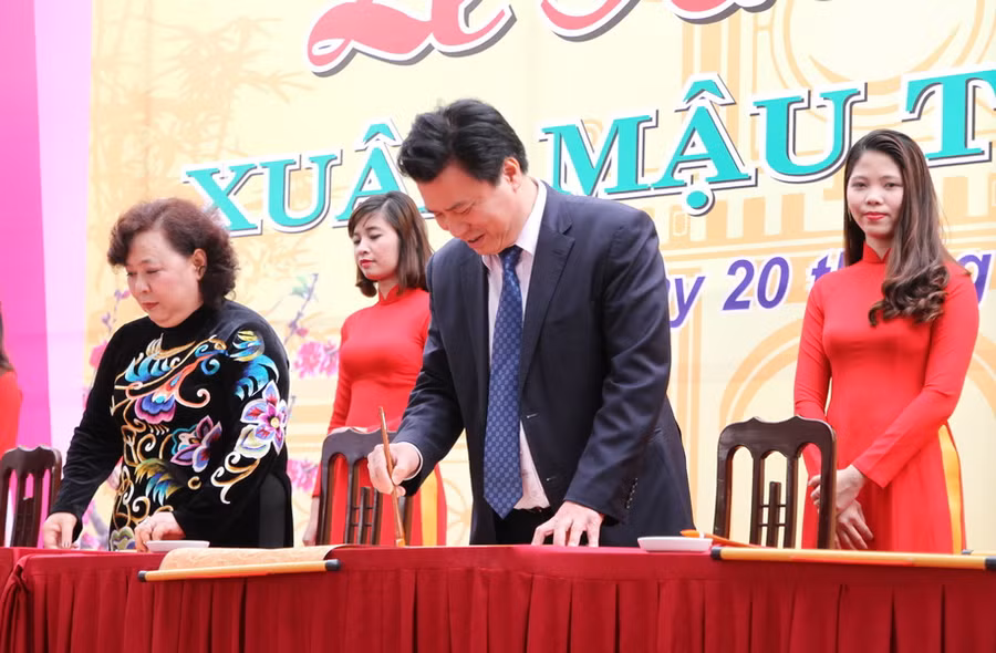 Thứ trưởng Nguyễn Hữu Độ cùng các đại biểu viết chữ tại lễ khai bút