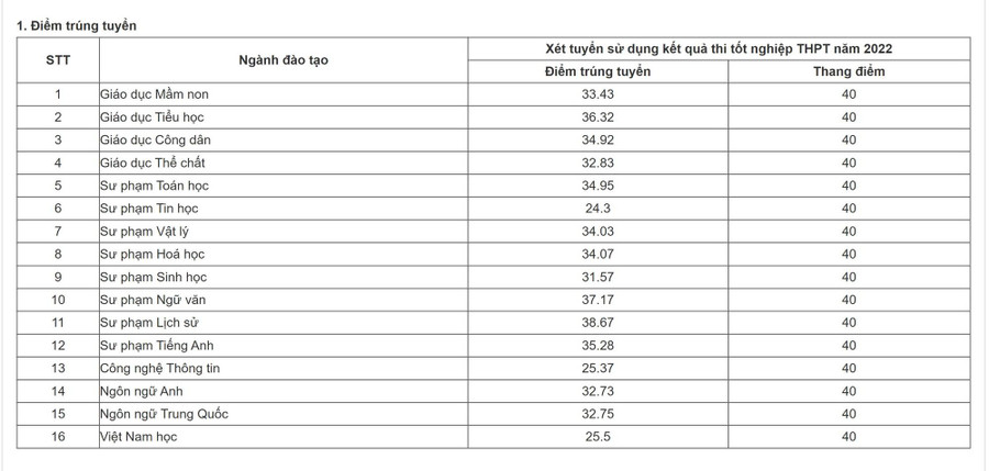 Ngành Sư phạm Lịch sử lấy điểm cao nhất (38,67, theo thang điểm 40). Giáo dục tiểu học (36,32 điểm), giáo dục mầm non (33,43 điểm). Sư phạm Tin học có mức điểm chuẩn thấp nhất (24,3 điểm).
