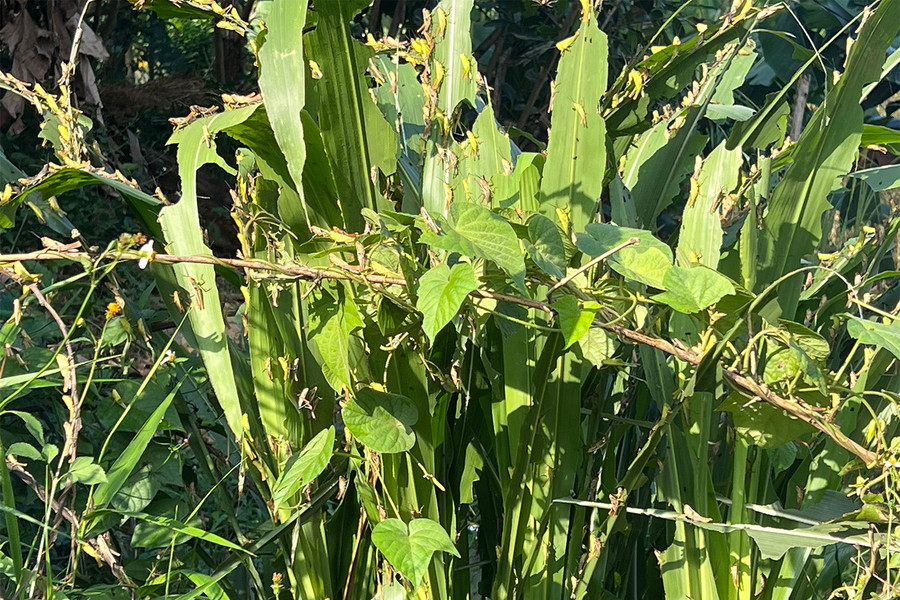 | Nhiều cây trồng như mía, ngô, lúa cũng bị châu chấu phá hoại. Ảnh: Lê Hùng. |