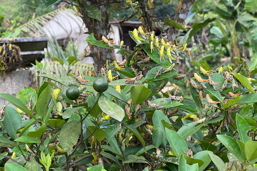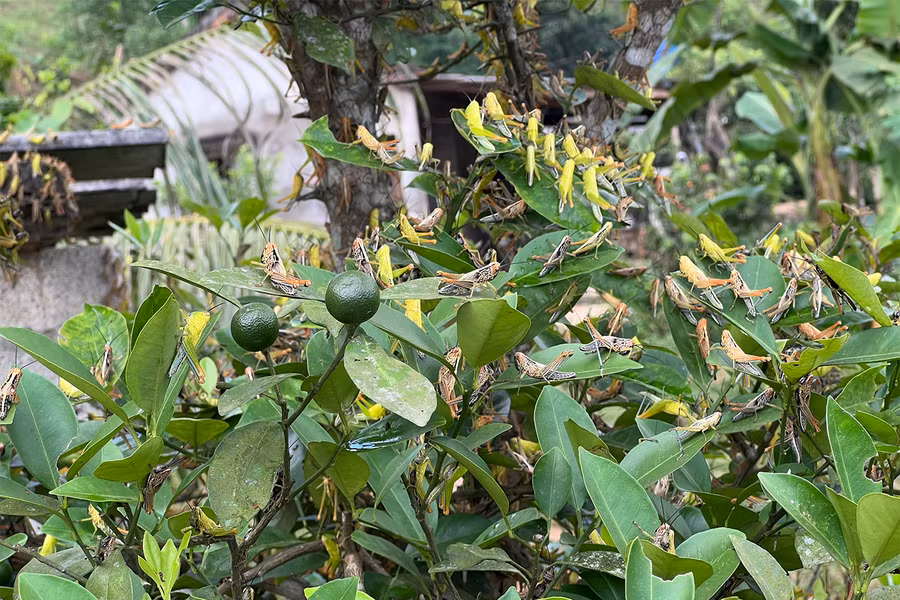 | Châu chấu có mặt khắp nơi, phá hoại bất cứ cây trồng nào chúng đi qua. Ảnh: Lê Hùng. |