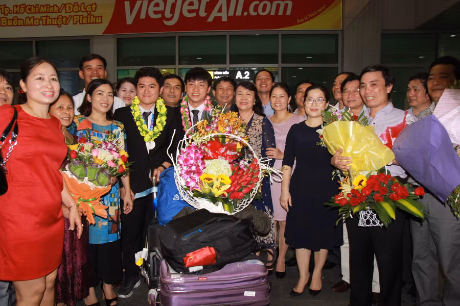 Tối 10/5, tại sân bay Vinh, đại diện sở GD&ĐT Nghệ An, các thầy cô trường THPT Phan Bội Châu và các học sinh đã có mặt để đón thầy Trần Văn Nga và 2 em Trần Hữu Bình Minh, Phan Tuấn Linh (học sinh lớp 12A3) trở về từ Kỳ thi Olympic Vật lý châu Á năm 2017 diễn ra từ ngày 1 - 9/5/2017 tại Liên bang Nga.