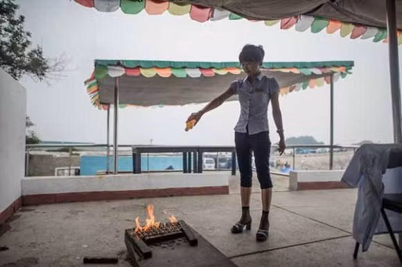 Người ta để xăng trong một chiếc chai rồi phun lên nghêu và châm lửa nướng. Họ sẽ tiếp thêm xăng cho đến khi nghêu chín.