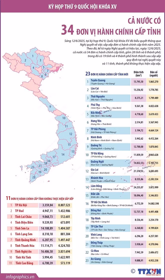 Sau khi sắp xếp, cả nước có 34 đơn vị hành chính cấp tỉnh, gồm 28 tỉnh và 6 thành phố; trong đó có 19 tỉnh và 4 thành phố hình thành sau sắp xếp và 11 tỉnh, thành phố không thực hiện sắp xếp là các tỉnh: Cao Bằng, Điện Biên, Hà Tĩnh, Lai Châu, Lạng Sơn, Nghệ An, Quảng Ninh, Thanh Hóa, Sơn La và thành phố Hà Nội, thành phố Huế.