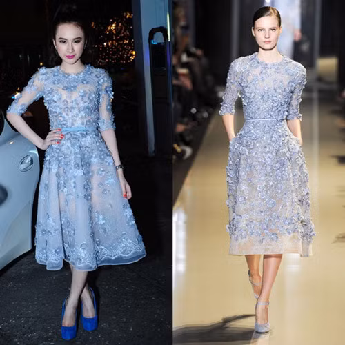 "Cơn sốt" mặc váy nhái của Elie Saab một lần nữa lại trỗi dậy với nghi án của cô nàng gái hư Angela Phương Trinh. Tái xuất sau scandal bỏ học, Angela Phương Trinh vướng vào một loạt nghi án mặc váy nhái của các thương hiệu đình đám, trong số đó có Elie Saab.