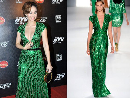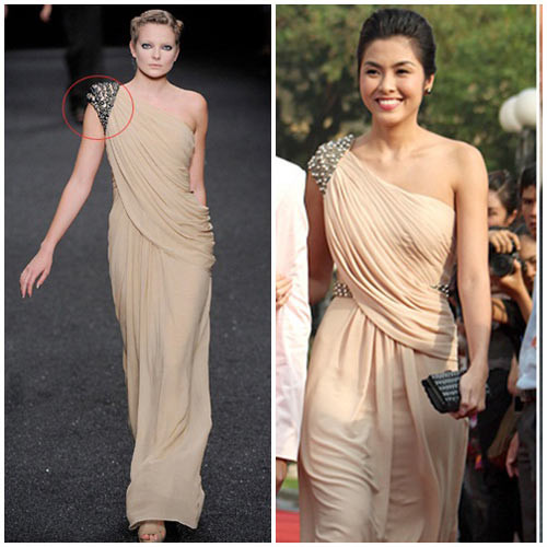 Được coi là biểu tượng thời trang của showbiz Việt nhưng Hà Hồ cũng không thoát khỏi nghi án mặc váy nhái của thương hiệu nổi tiếng. Tại lễ trao giải Cống hiến 2012, nữ ca sĩ chọn chiếc váy màu hồng cam, thiết kế hoa văn nổi một cách tỉ mỉ của nhà thiết kế Công Trí và nhận được nhiều lời khen ngợi.