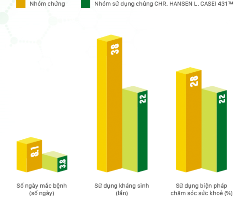 Trải qua 2 năm tiến hành, nghiên cứu này đã chứng minh được việc sử dụng chủng men L. CASEI 431™ có thể giúp rút ngắn thời gian bị cảm cúm và bệnh cảm thông thường với số ngày bệnh giảm từ 8.1 ngày (đối với nhóm dùng giả dược) xuống còn 4.8 ngày; đồng thời làm giảm việc sử dụng thuốc kháng sinh từ 38 lần xuống chỉ còn 22 lần.