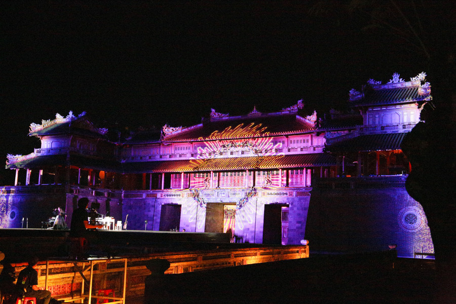 | Hệ thống âm thanh, ánh sáng được trình chiếu cổng, tường và lầu Ngũ Phụng khiến Ngọ Môn Huế liên tục biến hóa. (Ảnh: Đình Hoàng) |