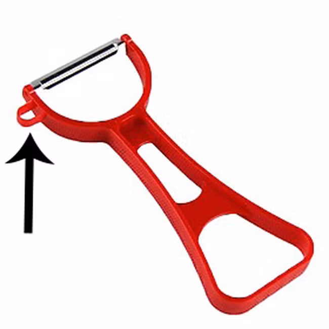 | Chiếc lỗ nhỏ bên cạnh lưỡi dao nạo là để "khoét" đi những chiếc mắt trên củ khoai. |