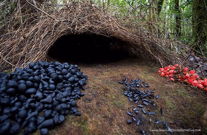 Những con chim trống dựng nên những ‘túp lều nhỏ từ cỏ và củi khô để thu hút bạn tình. Chúng còn trang trí cho chiếc tổ bằng những quả mọng, bọ cánh cứng, hoa đầy màu sắc