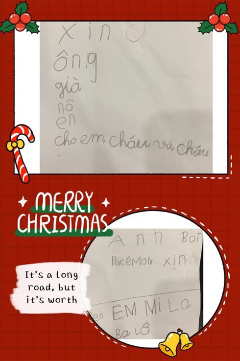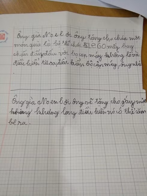 Bức thư gửi ông già Noel của hai bé Hà Thân, Hà Nguyên (học sinh lớp 1 tại Hà Nội) viết: “Ông già Noel ơi con tên là Hà Nguyên, con ở Cao Thắng. Con học ở Phan Đình Phùng lớp ¼, năm vừa qua con quét nhà phụ mẹ. Con học bài, con phụ cha phơi đồ, con thấy hơi ngoan một chút. Con xin ông già Noel một bộ xe cần cẩu. Con cảm ơn ông già Noel. Con chúc ông già Noel một chuyến bay vui vẻ”.