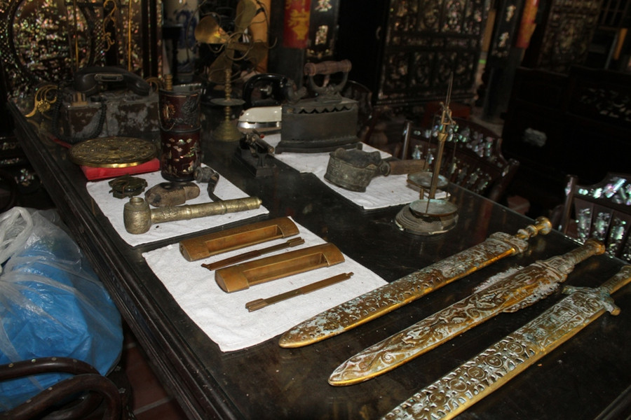Điểm nhấn trong gian chính của ngôi nhà cổ là cặp lộc bình cổ bằng đồng đỏ nặng trên 200kg; cặp hạc đứng trên mai rùa hơn 100kg và nhiều vật dụng giá trị như bàn ủi con gà bằng đồng lạnh (nặng 14kg), điện thoại cổ, máy hát cổ, kiếm cổ…