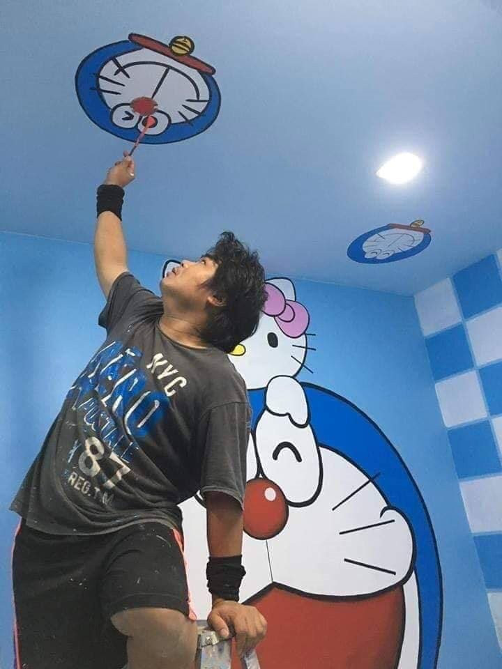 Mọi khoảng trống trên tường đều được lấp đầy bởi hình ảnh của Doraemon.