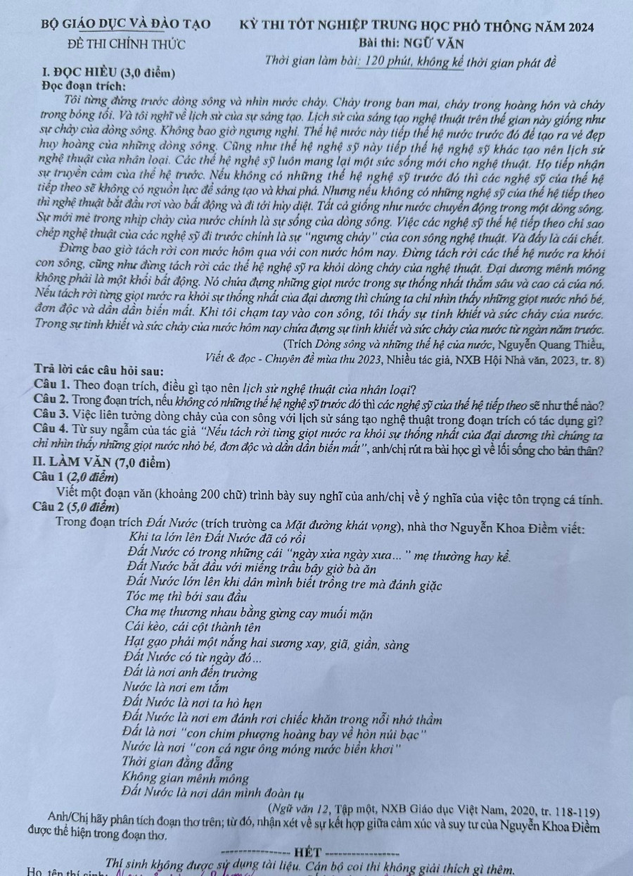 Sáng nay, ngày 27/6/2024, các thí sinh đã hoàn thành bài thi môn Ngữ văn. Đề thi năm nay hứa hẹn sẽ có những bài viết lay cảm trái tim giám bởi ngữ liệu Đọc hiểu gợi mối quan hệ cá nhân trong dòng chảy lịch sử, mối quan hệ của sự sáng tạo nghệ thuật hôm nay với mạch nguồn của dòng sông nghệ thuật. Phần nghị luận văn học chạm đến đề tài không bao giờ cũ: Đất nước và ý thức của mỗi cá nhân về cội nguồn đất nước.