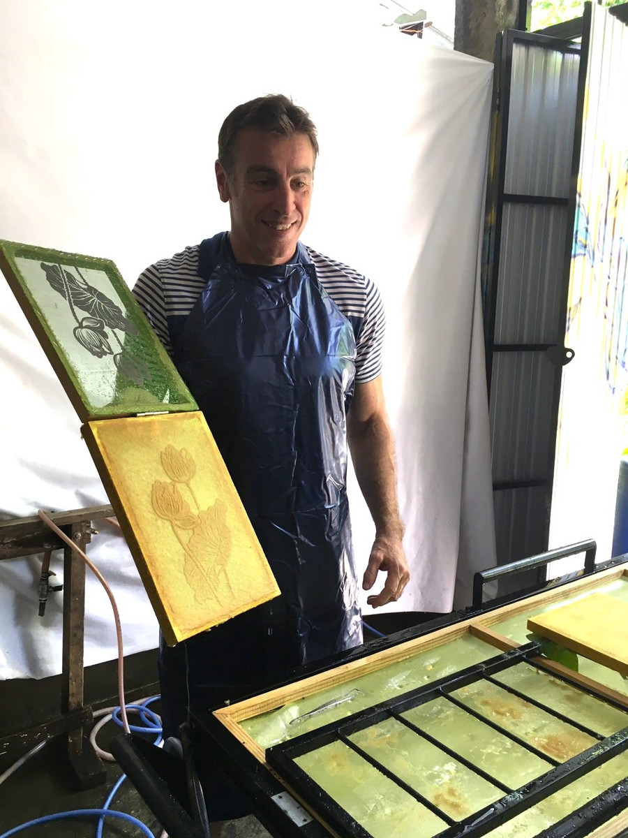Sau khi có được giấy, để tạo nên bức tranh cũng phải qua 10 bước. Đầu tiên là vẽ tay từng họa tiết rồi scan vào trong máy. Sau đó cắt decal và đưa hoa văn lên khung lưới để tạo khuôn giữ nét. Sau khi hoàn thiện khuôn mới bắt đầu đổ bột giấy và khắc vẽ tạo tác trên mặt giấy ướt để làm lớp.