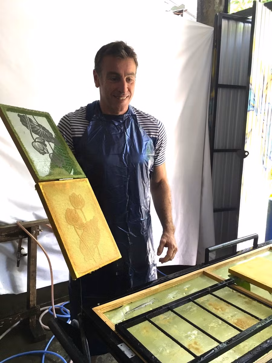 Đến khi cảm nhận được nét hằn vừa đủ trên khung, anh Hà tháo tấm decal. Một hình ảnh hoa sen và tượng Phật hiện ra trên khung với tấm bột. Anh chỉnh sửa lại bằng cách giảm nhẹ độ mạnh của vòi xịt nước và hoàn thành bức tranh. Công đoạn tiếp theo là phơi khô, vào khung và lên đèn…