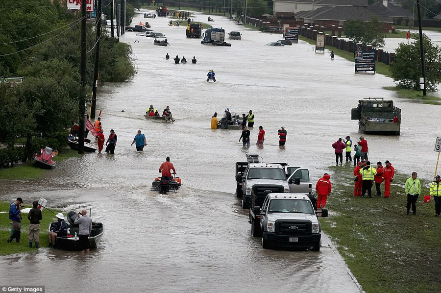 Sau cơn bão Harvey, một lượng mưa kỷ lục chưa từng có đã rơi xuống bang Texas, gây lụt lội trầm trọng, khiến 20.000 người phải dời nhà mình và đến các trung tâm hội nghị để trú ẩn.