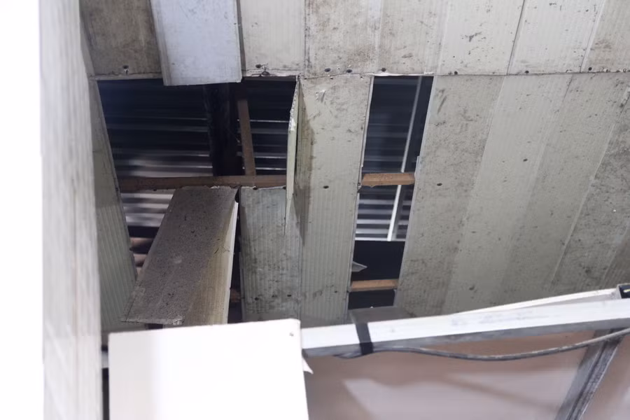Không thể xây mới, ông Chiến và con trai chỉ còn cách dùng những thanh gỗ nhỏ nẹp từng mảng trần bị hư hỏng và bắt thêm kết cấu đỡ bằng thép và trần nhựa để mưa đỡ dột vào nhà.