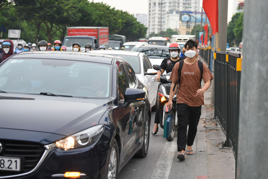 | Nhiều phương tiện phải đi lên vỉa hè để di chuyển. |