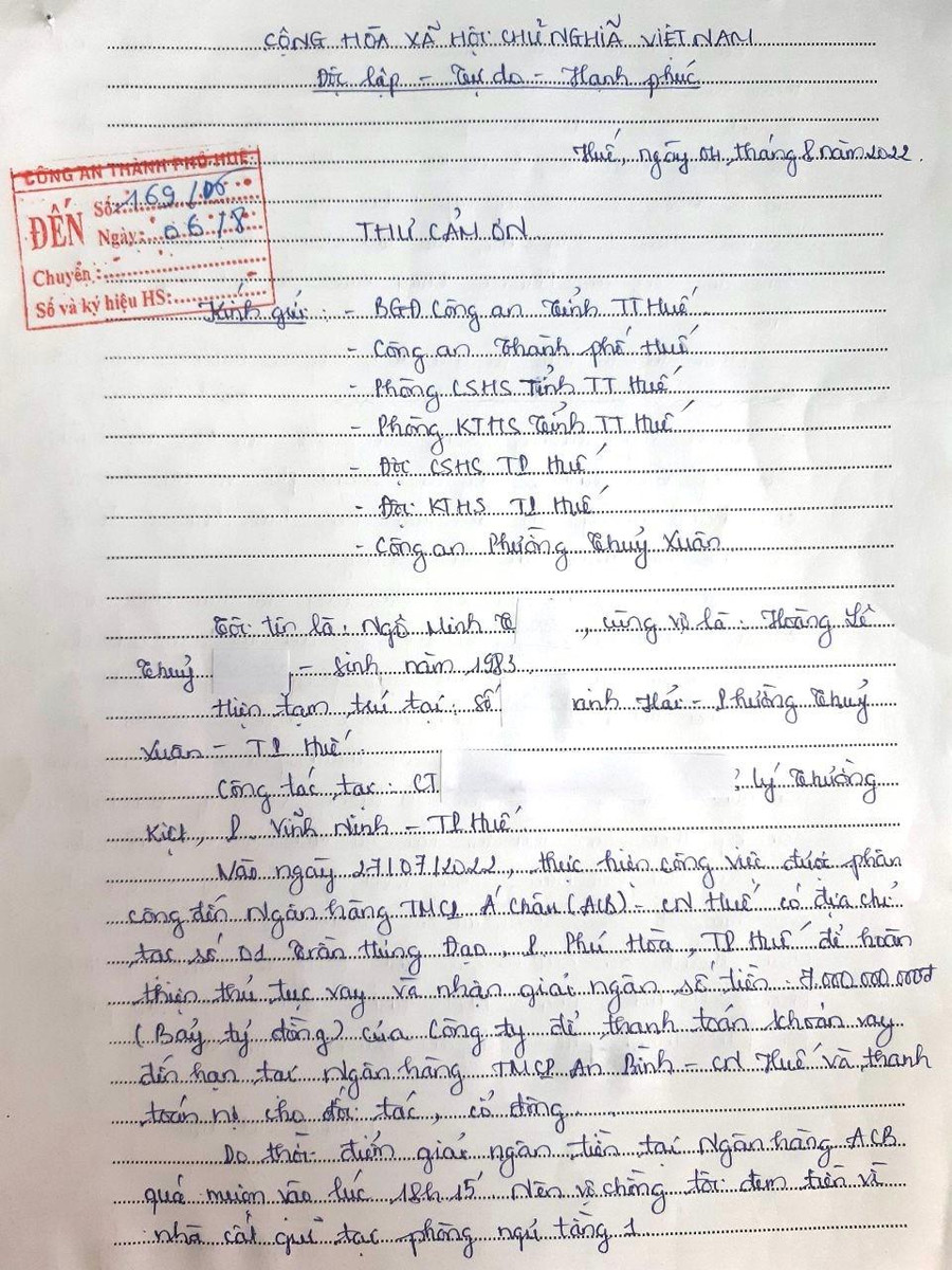 | Bức thư anh T. cảm ơn sâu sắc đến lực lượng Công an tỉnh Thừa Thiên - Huế, Công an TP Huế đã bắt được kẻ cắp, lấy lại được số tiền cho anh. |