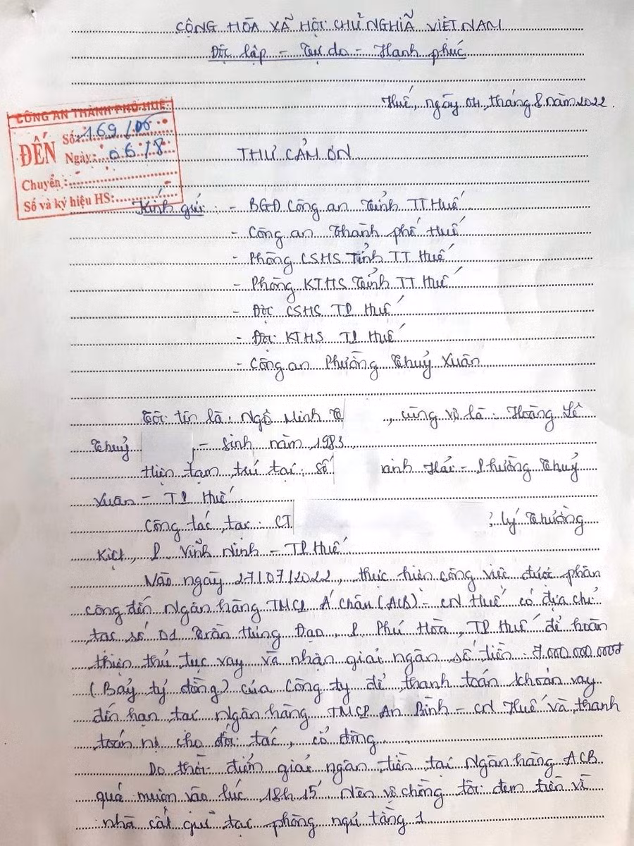Chiều 9/8, Công an TP Huế (tỉnh Thừa Thiên – Huế) cho biết, đơn vị vừa nhận được thư cảm ơn của anh Ngô Minh T. (SN 1983, trú tại phường Thủy Xuân, TP Huế) với nội dung “Gửi lời cảm ơn sâu sắc đến Ban Giám đốc Công an tỉnh, các Phòng nghiệp vụ, Công an thành phố Huế đã nhanh chóng bắt giữ đối tượng trộm hơn 1,7 tỷ đồng”.