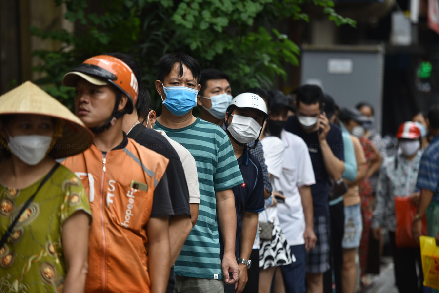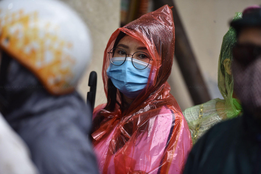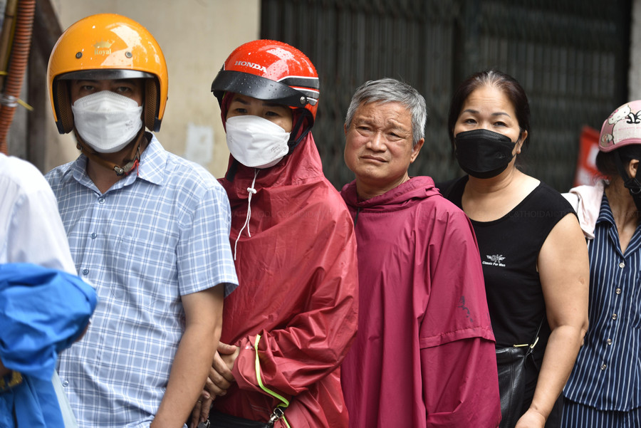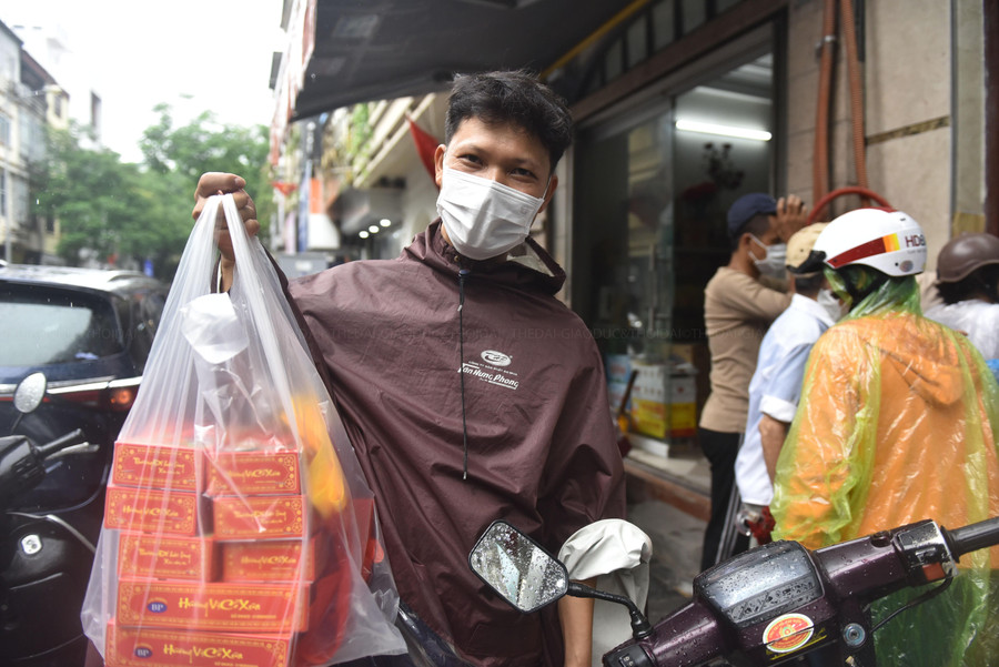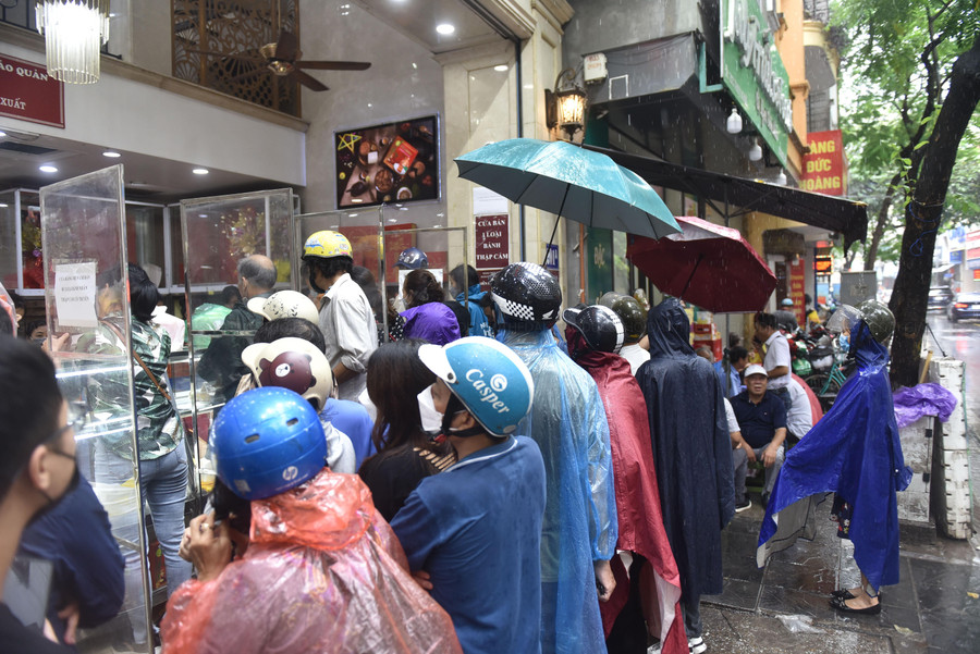 | Thời tiết Hà Nội có mưa, nhưng hàng người chờ để mua bánh vẫn không có dấu hiệu giảm. |