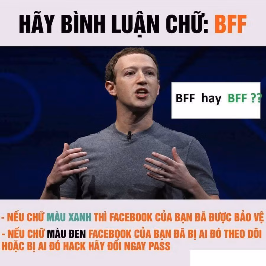 Hôm nay (21/3), người dùng Facebook tại Việt Nam tràn ngập hình ảnh Mark Zuckerberg, CEO Facebook với thông điệp đính kèm: "Hãy bình luận chữ: BFF. Nếu màu xanh thì Facebook của bạn đã được bảo vệ. Nếu màu đen Facebook của bạn đã bị ai đó theo dõi hoặc bị ai đó hack hãy đổi pass ngay".