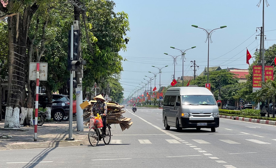 | 12h trưa, nhiều người lao động vẫn phải đội nắng ra đường mưu sinh trên tuyến đường QL 1A (TP Hà Tĩnh). |