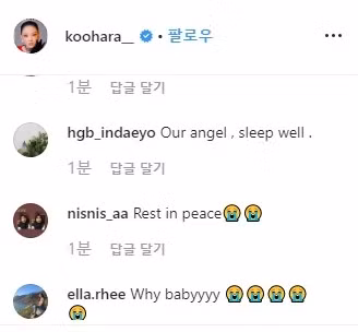Sau khi tin tức cựu thành viên Kara qua đời ở tuổi 28, cộng đồng người hâm mộ trên thế giới đã vô cùng bàng hoàng. Hàng loạt fan đã bày tỏ sự đau buồn thông qua việc bình luận vào bức ảnh này trên Instagram của nữ ca sĩ.