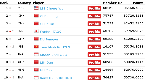 Bảng xếp hạng các tay vợt cầu lông hàng đầu thế giới: