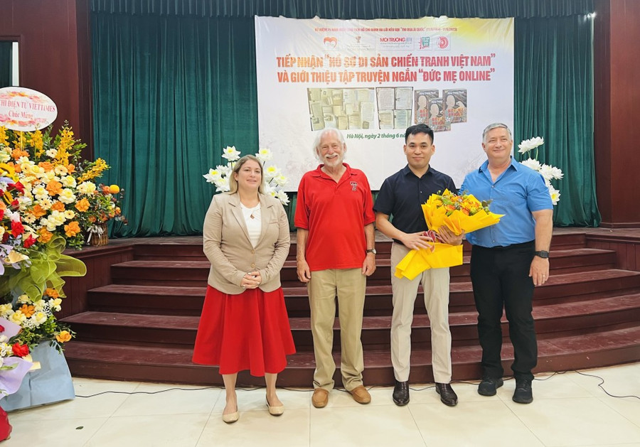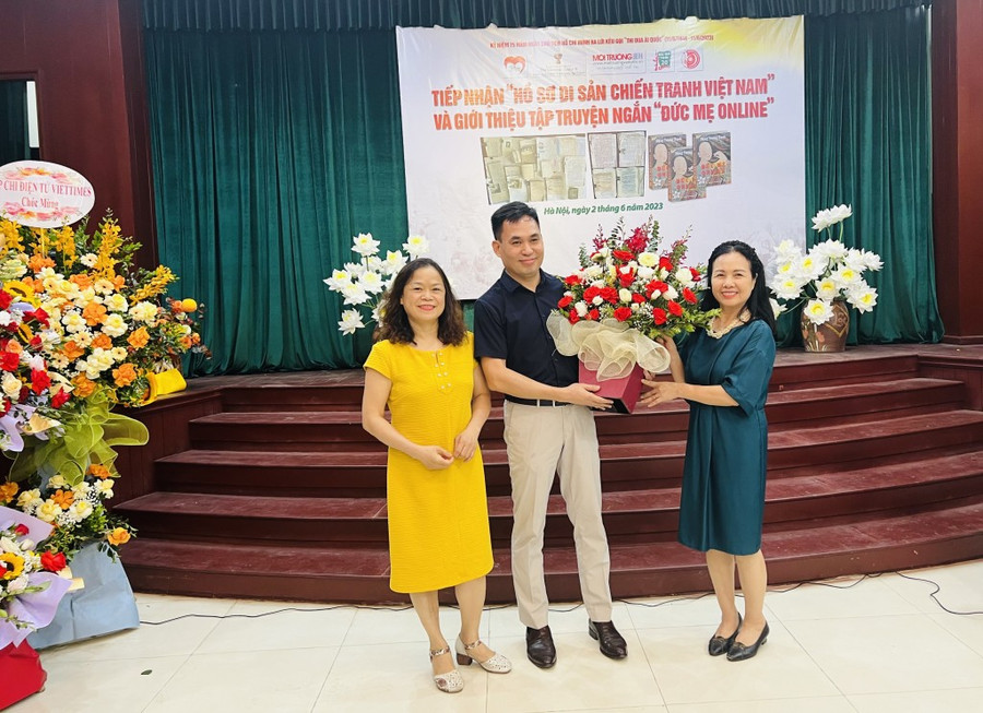 | Nhà văn, nhà báo Đặng Vương Hạnh nhận hoa chúc mừng từ các tổ chức, đơn vị trong buổi ra mắt tập truyện ngắn "Đức mẹ online". |