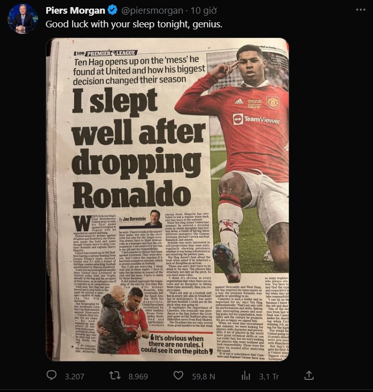 Cụ thể, Morgan trích lại bài báo có tiêu đề: "Erik ten Hag ngủ ngon sau khi loại bỏ Ronaldo" trong đó nói về việc HLV Ten Hag chia sẻ với truyền thông rằng ông ngủ rất ngon sau khi đưa ra quyết định để cho ngôi sao người Bồ Đào Nha Cristiano Ronaldo ra đi.