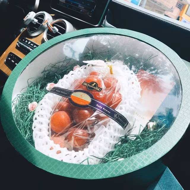 Chị Nguyễn Ngọc Huyền, chủ cửa hàng cho biết, mỗi chùm nho có trọng lượng khoảng 600-700 gram, khoảng 26-30 quả, được bọc trong túi bóng kính và đóng hộp giấy sang trọng. Loại nho này quả to, vỏ màu đỏ anh đào, các quả nho chín đều, căng mọng lớn như trái bóng bàn.