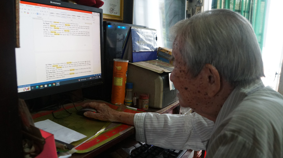 Một buổi chiều cuối tháng 6, căn phòng rộng khoảng 16m2 của cụ Nguyễn Đình Tư lọc cọc tiếng gõ bàn phím kiểu “mổ cò”. Cụ Tư đang tập trung đánh máy nốt những dòng cuối cùng của trang 140, bản thảo cuốn “Từ điển địa danh hành chính Trung Bộ”.