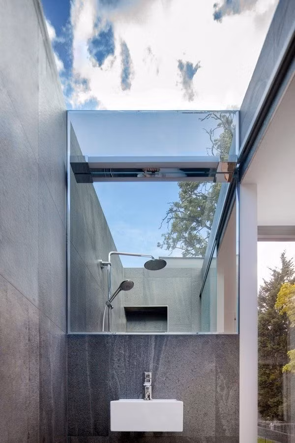Ngôi nhà được thiết kế gồm một tầng hầm với các giếng trời, kính là vật liệu được sử dụng nhiều trong cấu trúc chính của ngôi nhà nhằm tạo ra một không gian sống mở cho người ở.