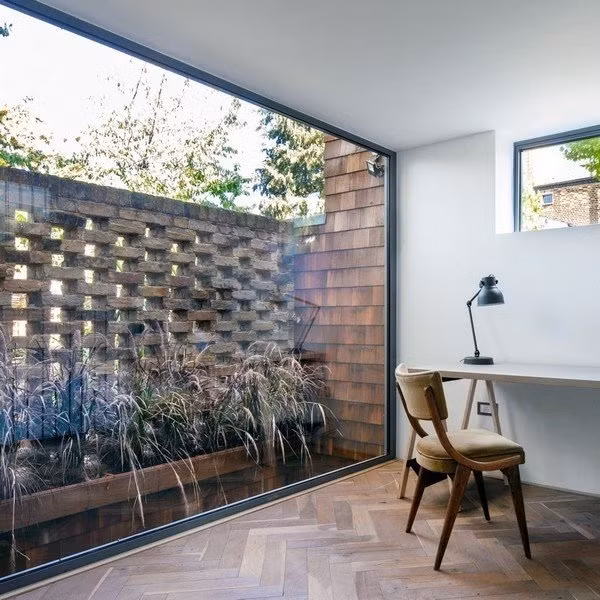 Phòng ngủ được thiết kế với bức tường kính lớn nhìn ra khu vườn đầy cây xanh được ngăn cách bởi bức tường gạch đục lỗ cổ kính, yên bình.