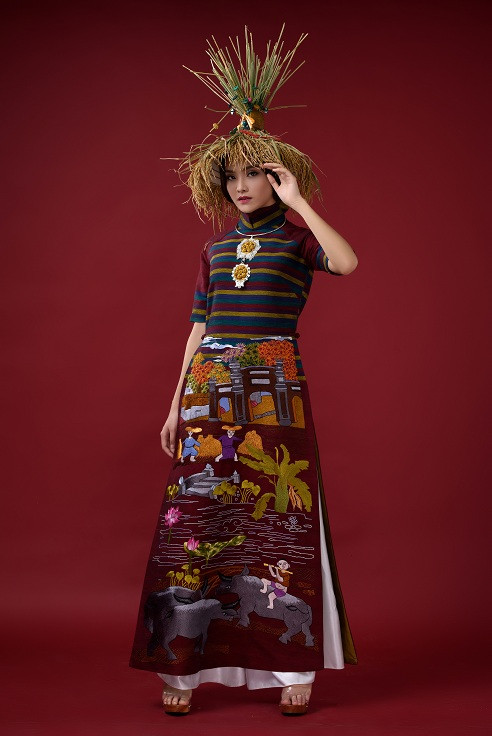 Những bộ áo dài đặc biệt mang đậm dấu ấn Hoàng cung thông qua nét thêu tay truyền thống với các hoa văn, họa tiết trên trang phục Cung đình. Họa tiết dân gian là những hình tượng được lưu truyền tự nhiên trong dân gian, thể hiện tư duy, suy nghĩ, ước muốn của con người với thiên nhiên và cuộc sống.