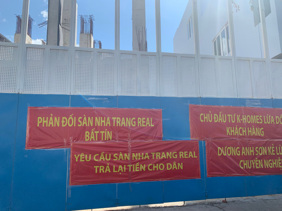 Còn tại đường 2/4, phường Vĩnh Hải, TP Nha Trang, một số khách hàng của dự án cao ốc K-Homes cũng treo băng rôn phản đối chủ đầu tư K-Homes và sàn bất động sản Nha Trang Real bất tín lừa khách hàng.
