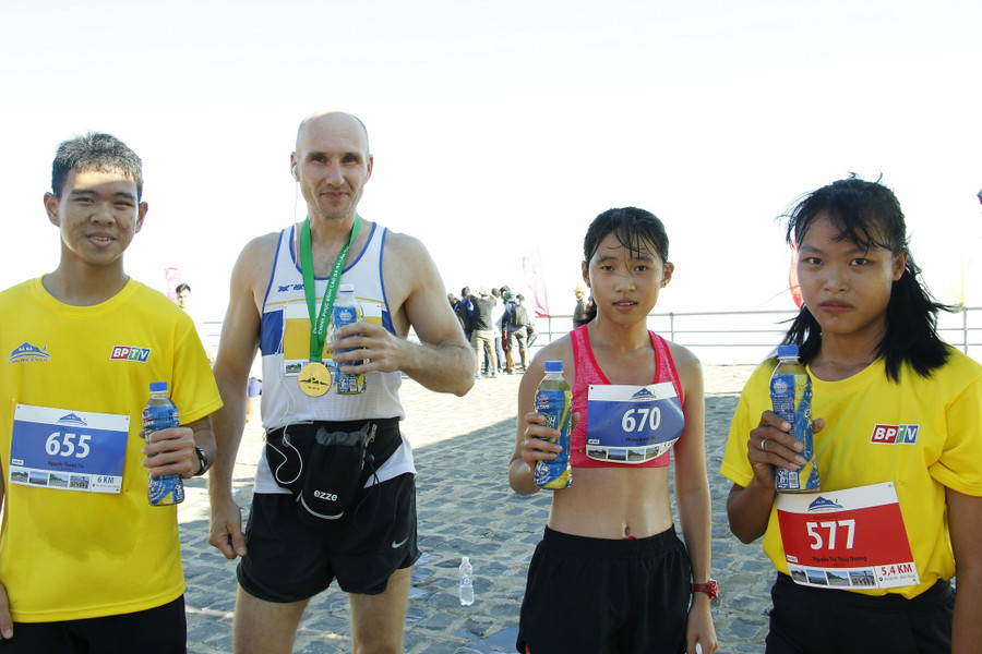 | Thanh Vũ chia sẻ với các VĐV tại đích đến |