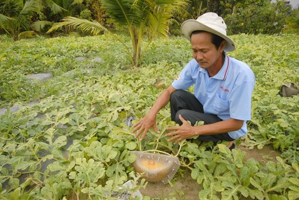 Theo ông Liêm, dưa hấu trồng khoảng 2 tháng 15 ngày có thể thu hoạch. Để tạo dáng cho quả dưa theo ý muốn thì khi xuống giống khoảng 25 ngày, lúc dưa bắt đầu ra trái, ông đã chọn quả, cho vào khuôn, tạo dáng dần dần.
