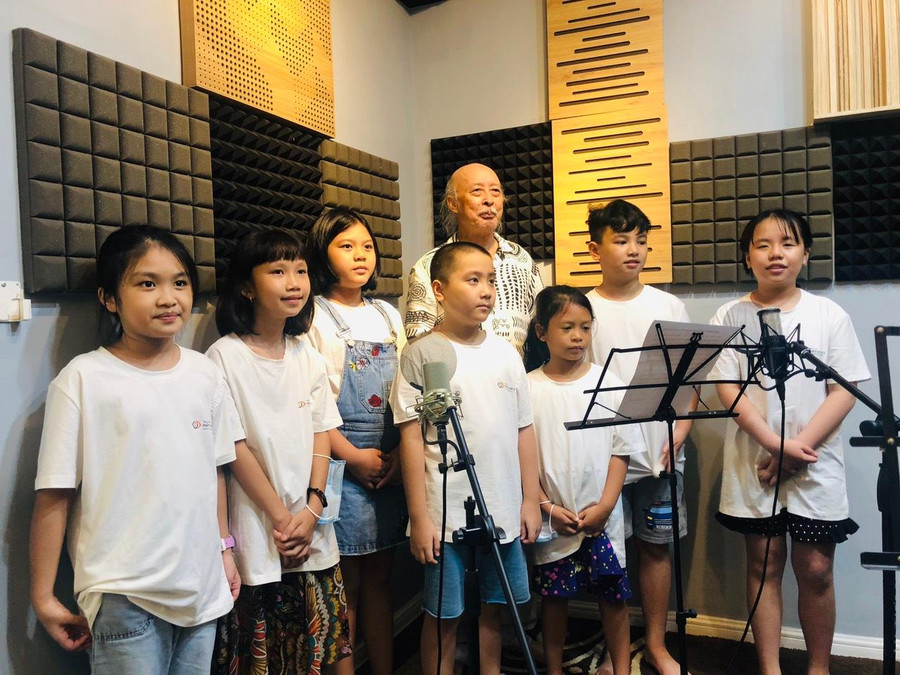 | Nhạc sĩ Trần Ngọc hướng dẫn các cháu thiếu nhi tập múa hát chuẩn bị cho đêm nhạc “Cánh chim lạc Việt”. |