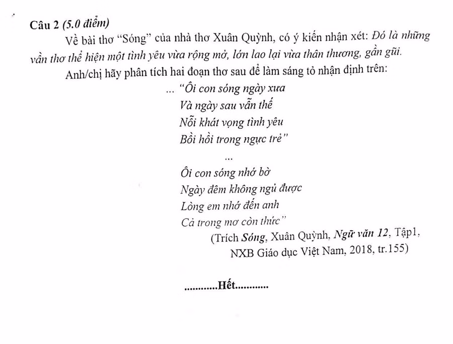 Yêu cầu nghị luận đã bám sát cấu trúc đề tham khảo của Bộ cho kì thi THPT quốc gia 2019, cụ thể là yêu cầu phân tích 2 khổ thơ trong hai đoạn khác nhau của bài Sóng để làm sáng tỏ một nhận định trong đề.