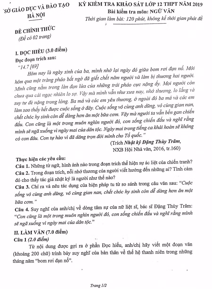 Đề kiểm tra khảo sát lớp 12 của Sở GD&ĐT Hà Nội: