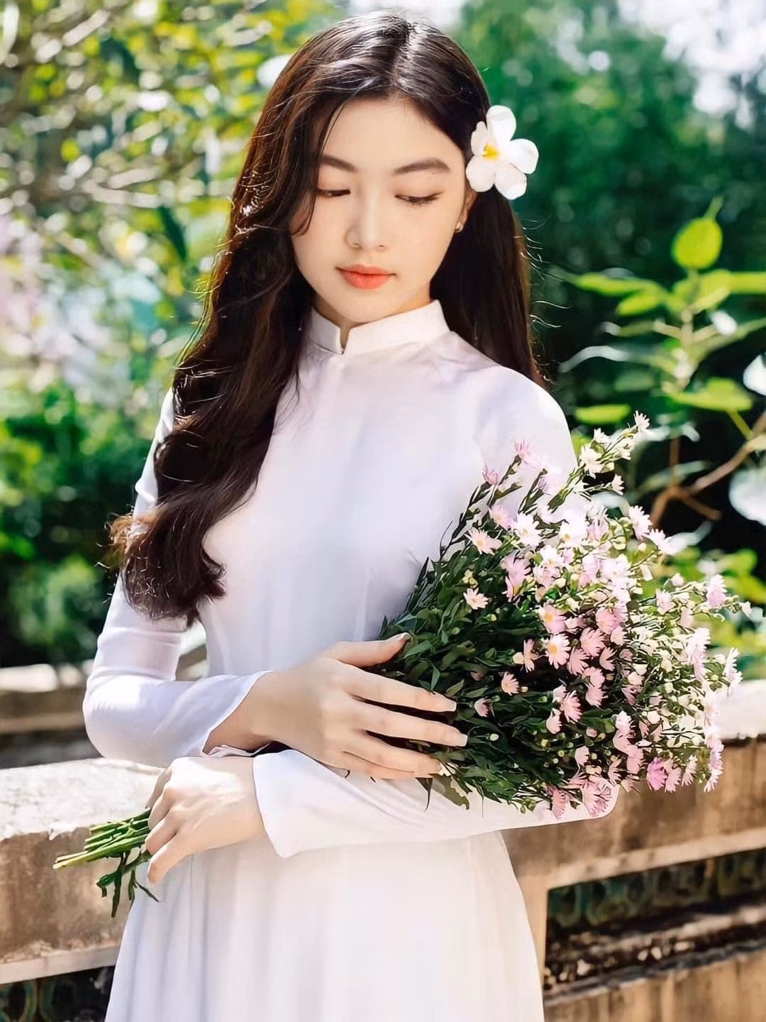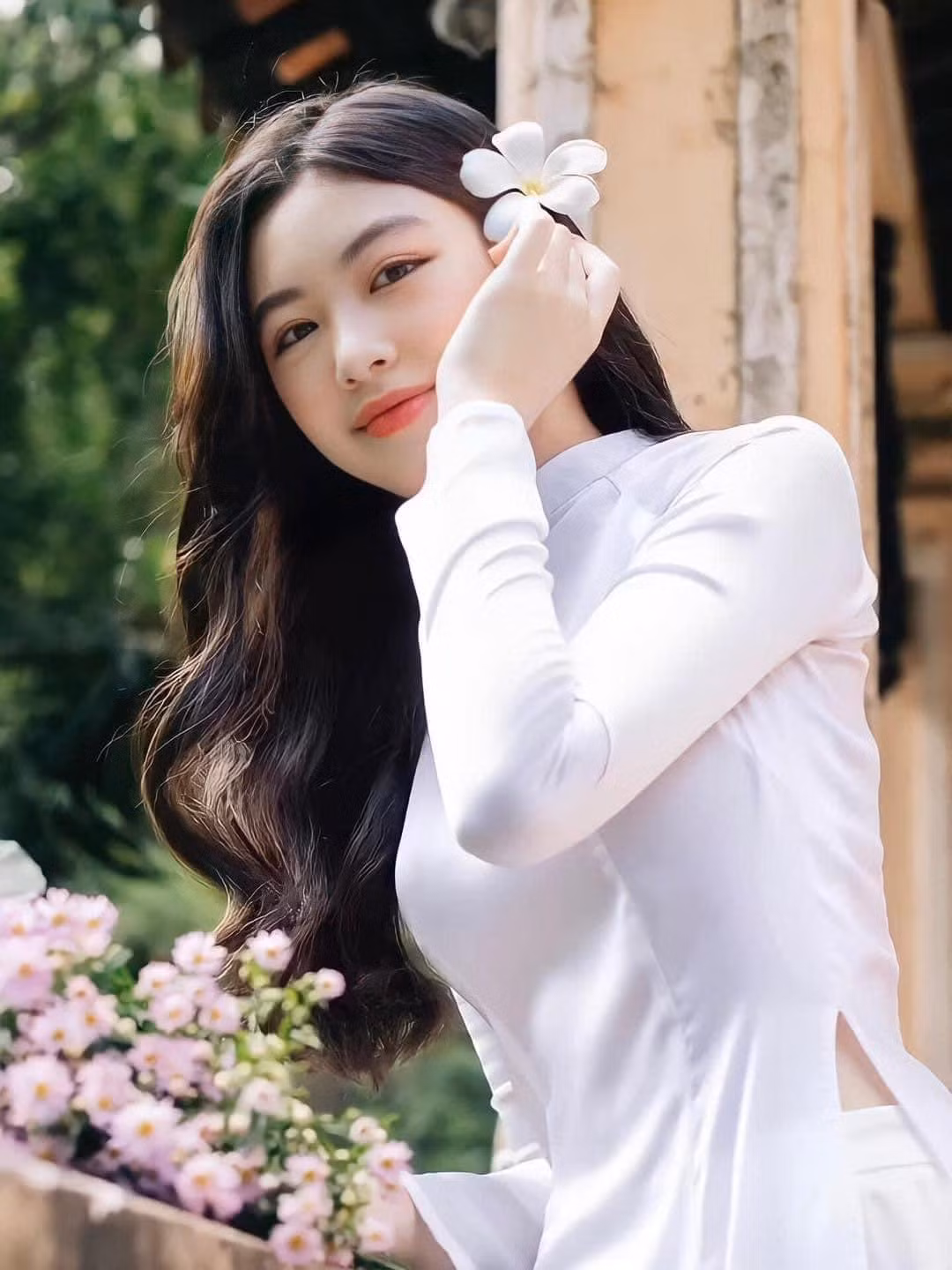 Lọ Lem chỉ diện áo dài trắng đơn giản nhưng lại "đốn tim" bao người bởi nhan sắc quá đỗi xinh đẹp. Mái tóc đen dài, khuôn mặt thanh tú cùng vóc dáng thon thả của cô bé khiến dân mạng không ngừng xuýt xoa, khen ngợi.