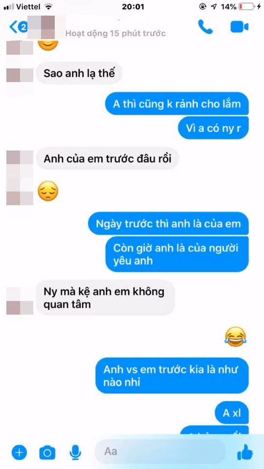 Cô gái liên tục "à ơi" và thậm chí còn hỏi những câu gợi lại ngày xưa, còn dùng gia đình để làm cái cớ. Thật đáng khen cho cô nàng người yêu cũ có lớp da mặt khá dày này, biết rõ thái độ của người ta vẫn cứ cố "vứt cả liêm sỉ".