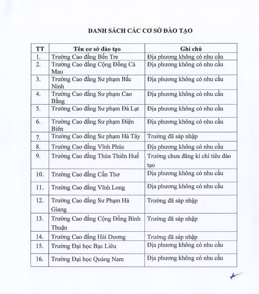 16 cơ sở đào tạo trực thuộc các địa phương đã có văn bản đề nghị không có nhu cầu đào tạo giáo viên, hoặc đã sáp nhập với các cơ sở đào tạo khác, hoặc chưa đăng ký chỉ tiêu đào tạo năm 2023.