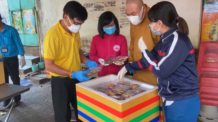 | Bà con cư dân ở chung cư Hòa Bình, quận 10 được bếp ăn từ thiện Tường Nguyên, Phường 8, Quận 4 ủng hộ với hơn 350 suất ăn trưa nay |