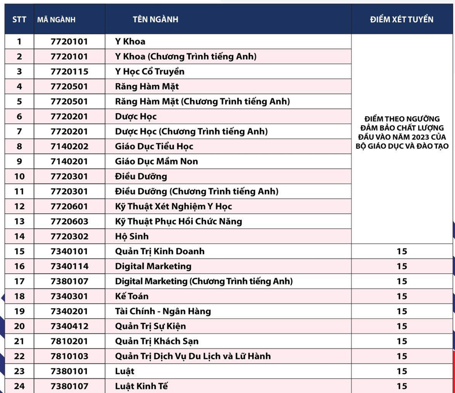 Theo đó, với cơ sở chính ở TPHCM, trường lấy điểm sàn 19 cho tất cả ngành (trừ ngành Dược học). Với bậc đại học chương trình chất lượng cao và chương trình liên kết quốc tế, điểm sàn là 18.