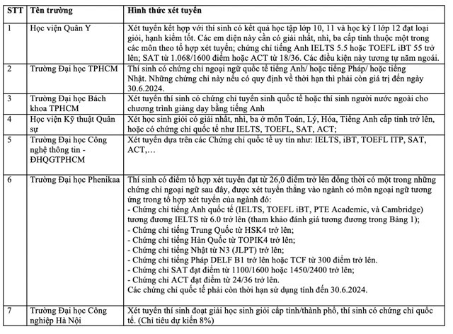 Thí sinh là học sinh các trường THPT khác đoạt giải Nhất, Nhì, Ba trong các kỳ thi chọn học sinh giỏi cấp tỉnh/thành phố cấp THPT hoặc có chứng chỉ ngoại ngữ quốc tế: IELTS hoặc TOEFL iBT hoặc TOEIC; DELF hoặc TCF; HSK và HSKK; chứng chỉ Tin học Quốc tế MOS (thời hạn 2 năm tính đến ngày 19/05/2024).