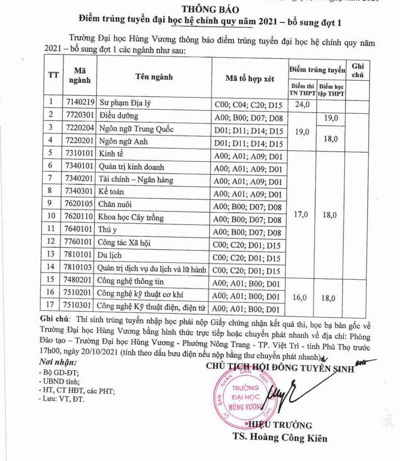 Trường ĐH Hùng Vương (Phú Thọ) thông báo điểm trúng tuyển đại học hệ chính quy năm 2022 – bổ sung đợt 1. Các ngành cụ thể như sau: